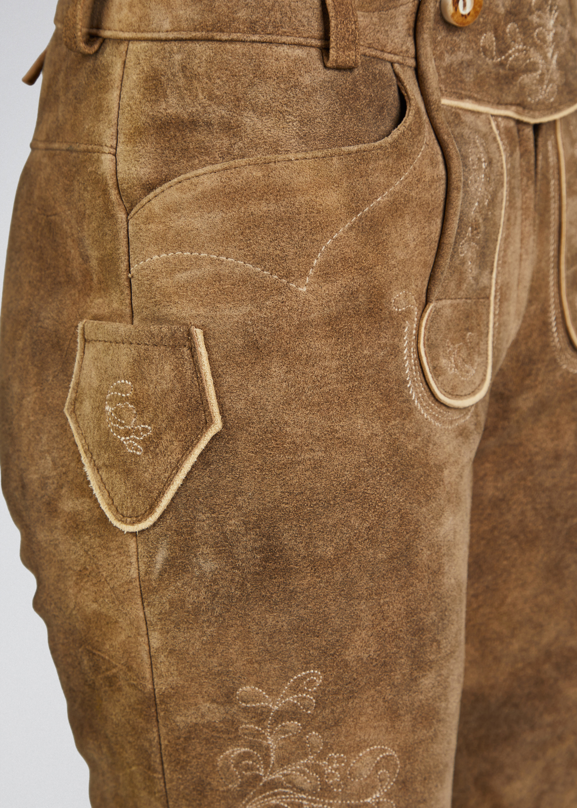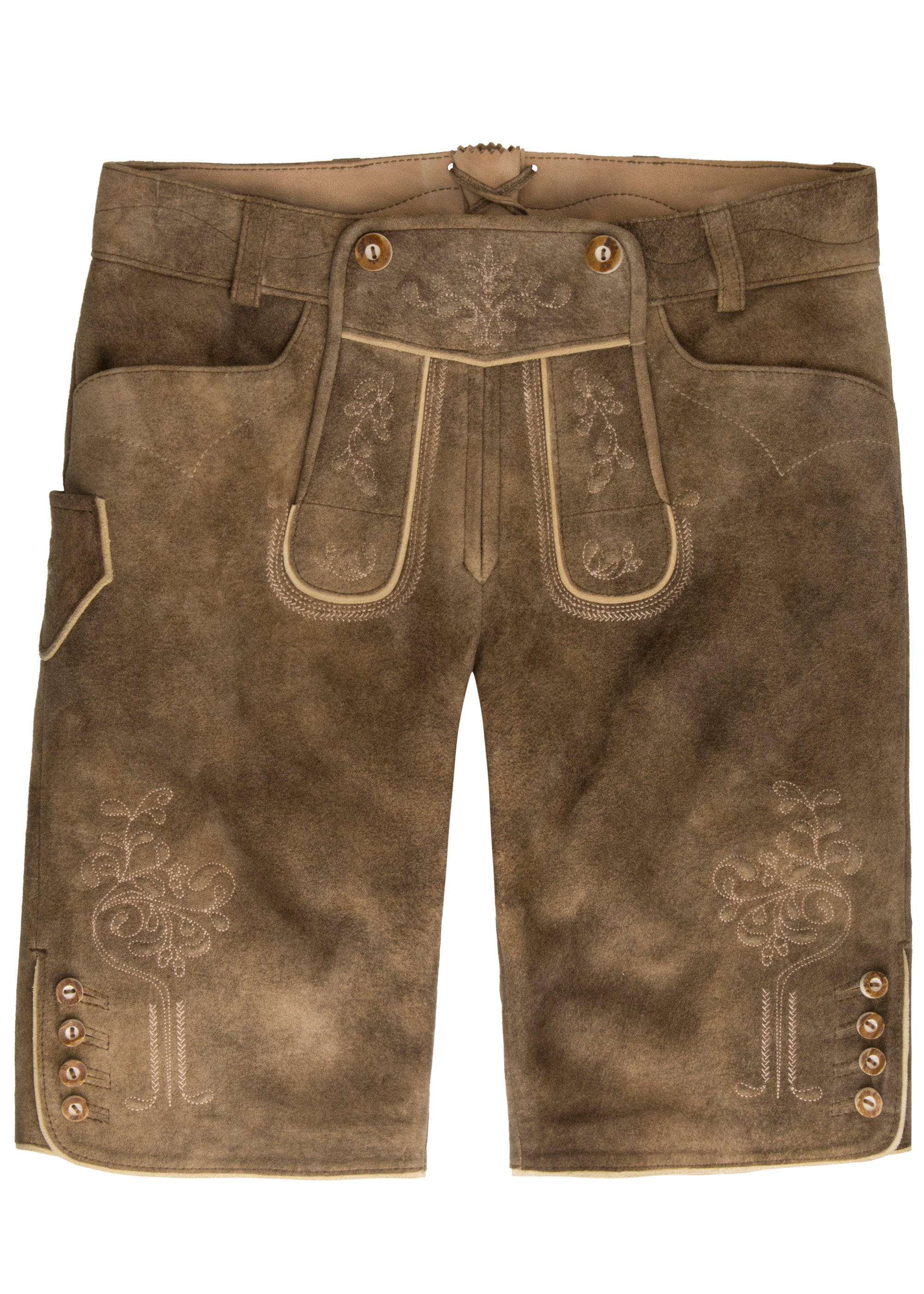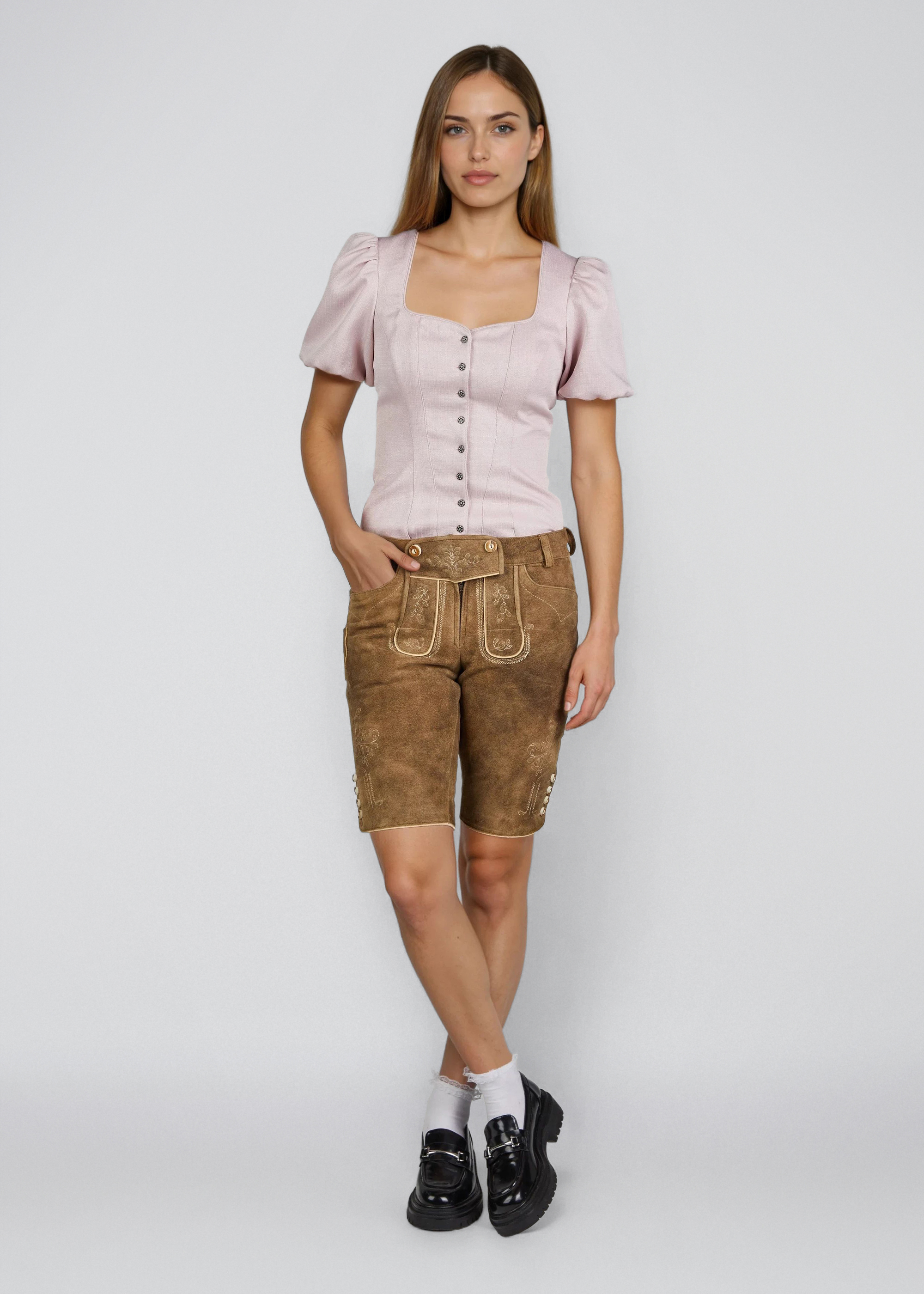 Fabiola-Lederhose – kurze Lederhose für Damen Die Fabiola-Lederhose aus 100% Leder überzeugt durch liebevolle Details und hohe Verarbeitungsqualität. Sie besticht mit filigranem, hellem Stick und Knöpfen am Beinabschluss, während die ohne Tellernaht gestaltete Linie klar und modern wirkt. Mit einer Länge von 42 cm ist die Hose ideal für Damen, die kurze Trachten-Lederhosen lieben und sie vielseitig zu Blusen oder festlicher Trachtenmode kombinieren möchten. Komfortabel, stilvoll und traditionsbewusst – perfekt für jeden Anlass.