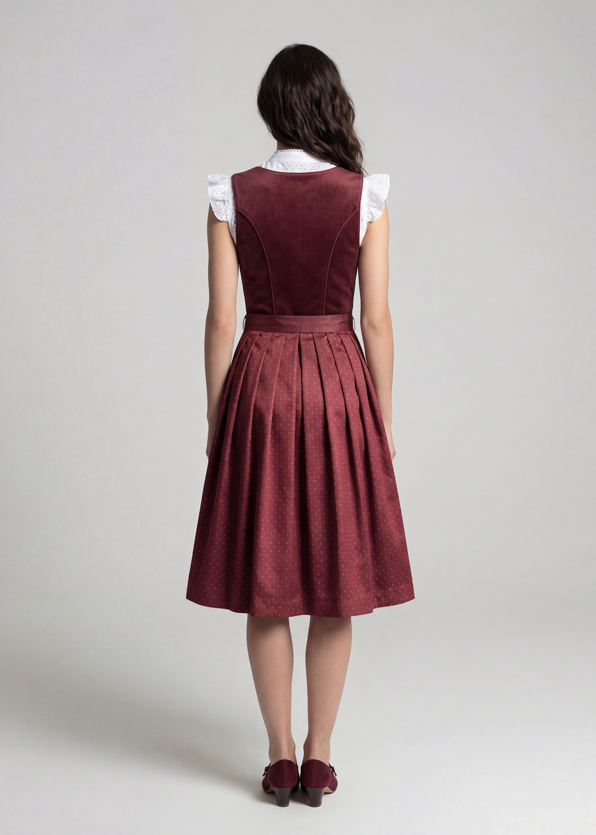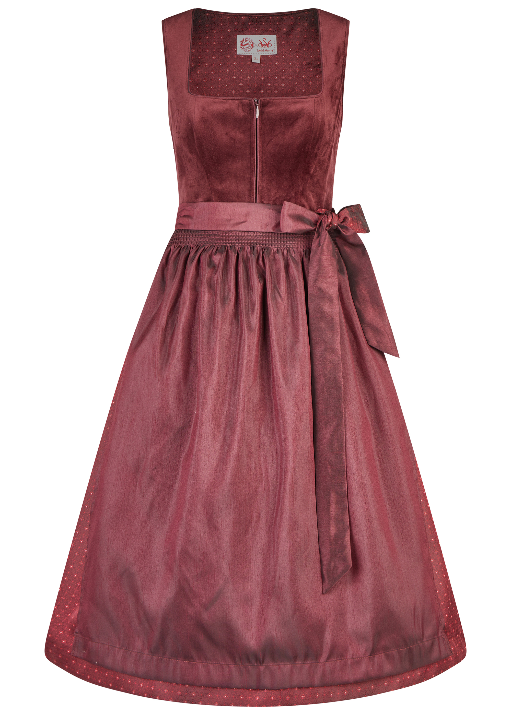 Erleben Sie zeitlose Eleganz mit diesem exquisiten Hedi Dirndl in einem tiefen Bordeauxrot, das klassische Tradition mit moderner Raffinesse verbindet. Der luxuriöse Samt des Mieders verleiht dem Kleid eine edle Note, während der elegante Ausschnitt Ihre feminine Silhouette betont. Ein dezenter Reißverschluss vorne sorgt für eine perfekte Passform und höchsten Tragekomfort. Der weit schwingende Rock aus schimmerndem Taft harmoniert perfekt mit der schlichten, aber wirkungsvollen Schürze, die mit einem stilvollen Schleifenband akzentuiert wird. Dieses Dirndl ist nicht nur ein Ausdruck von Tradition, sondern auch ein Statement für anspruchsvollen Stil und unvergessliche Auftritte bei jedem besonderen Anlass.