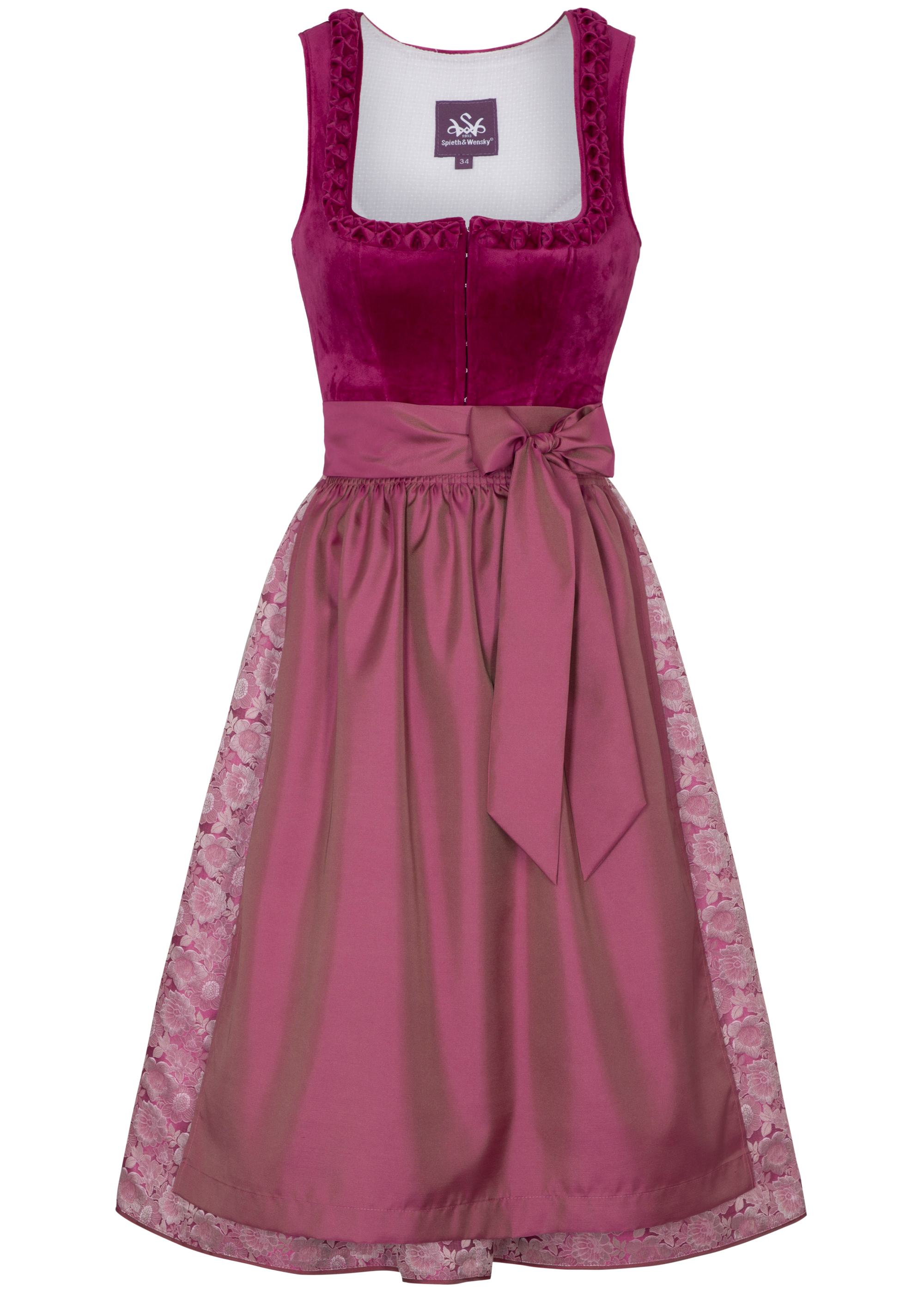 Verspielt und farbenfroh zeigt sich das Dirndl 'Gloria' von Spieth & Wensky. Das samtige Oberteil besticht durch seine lebendige Farbe und wird am eckigen Ausschnitt von dekorativen Rüschen geschmückt. Gleichzeitig sorgt der 70 cm lange, floral gemusterte Rock für eine harmonische Farbenvielfalt. Die elegante Schürze hebt sich ebenfalls farblich ab, und die Schleife vollendet das stimmige Design von 'Gloria'.
