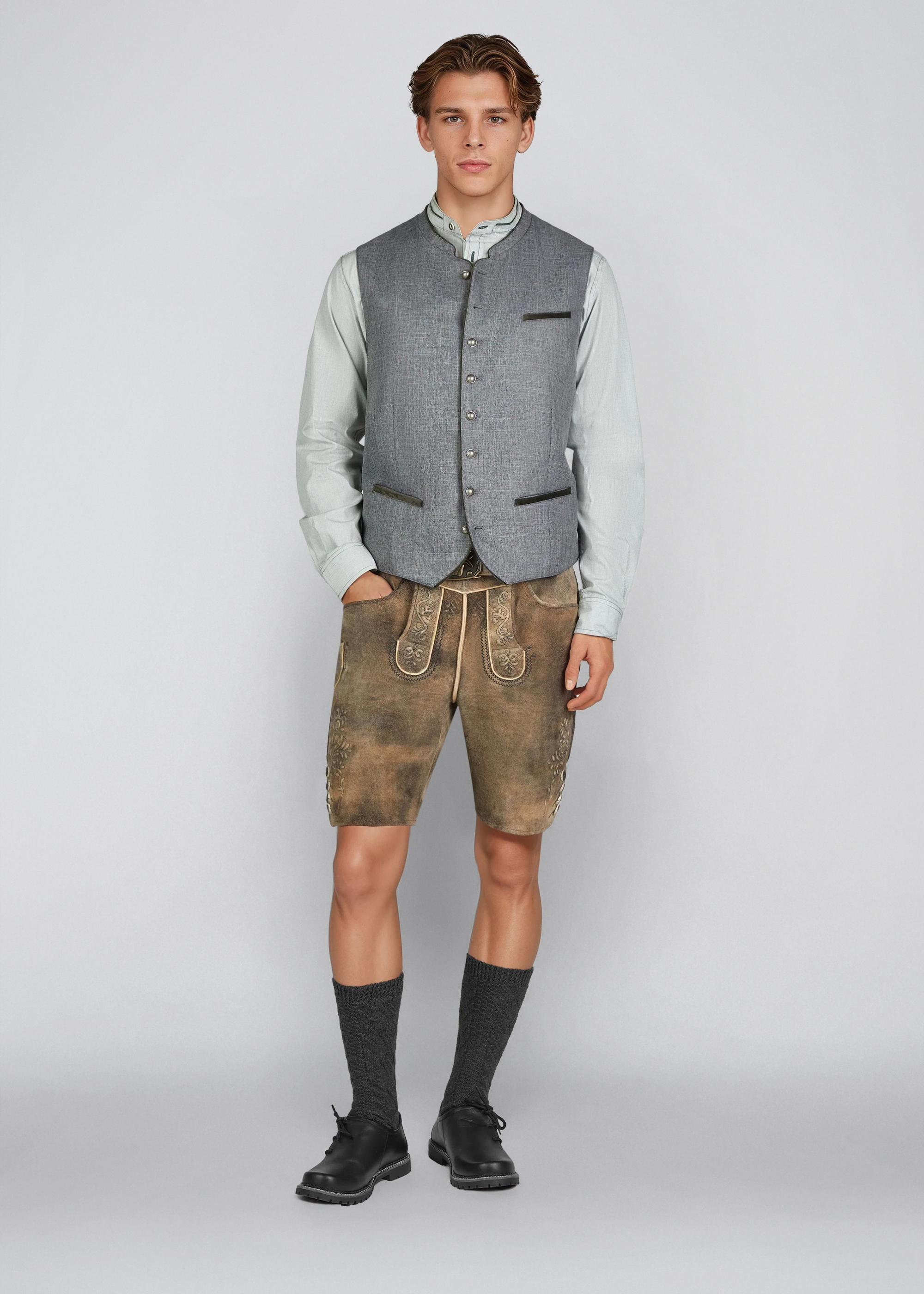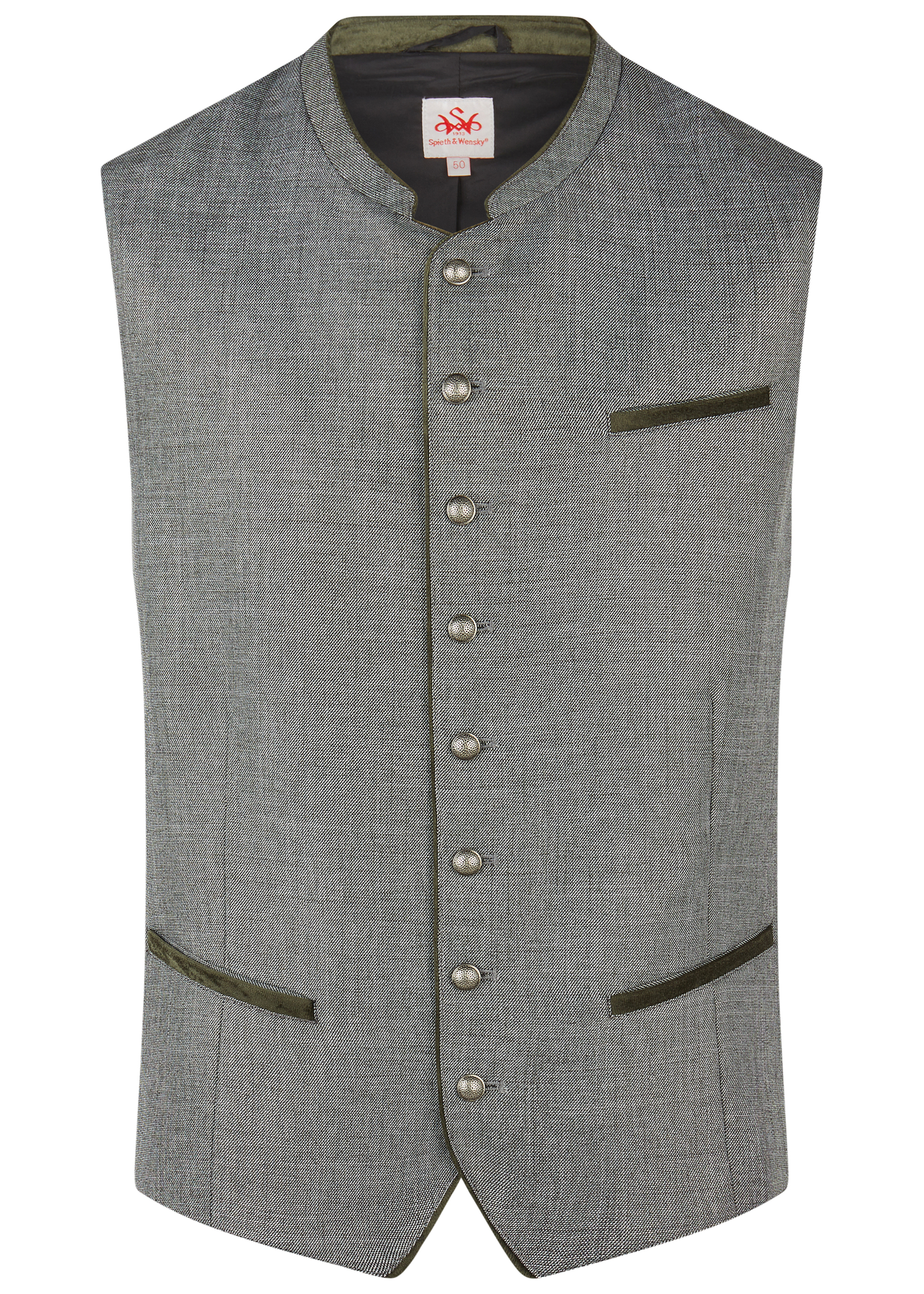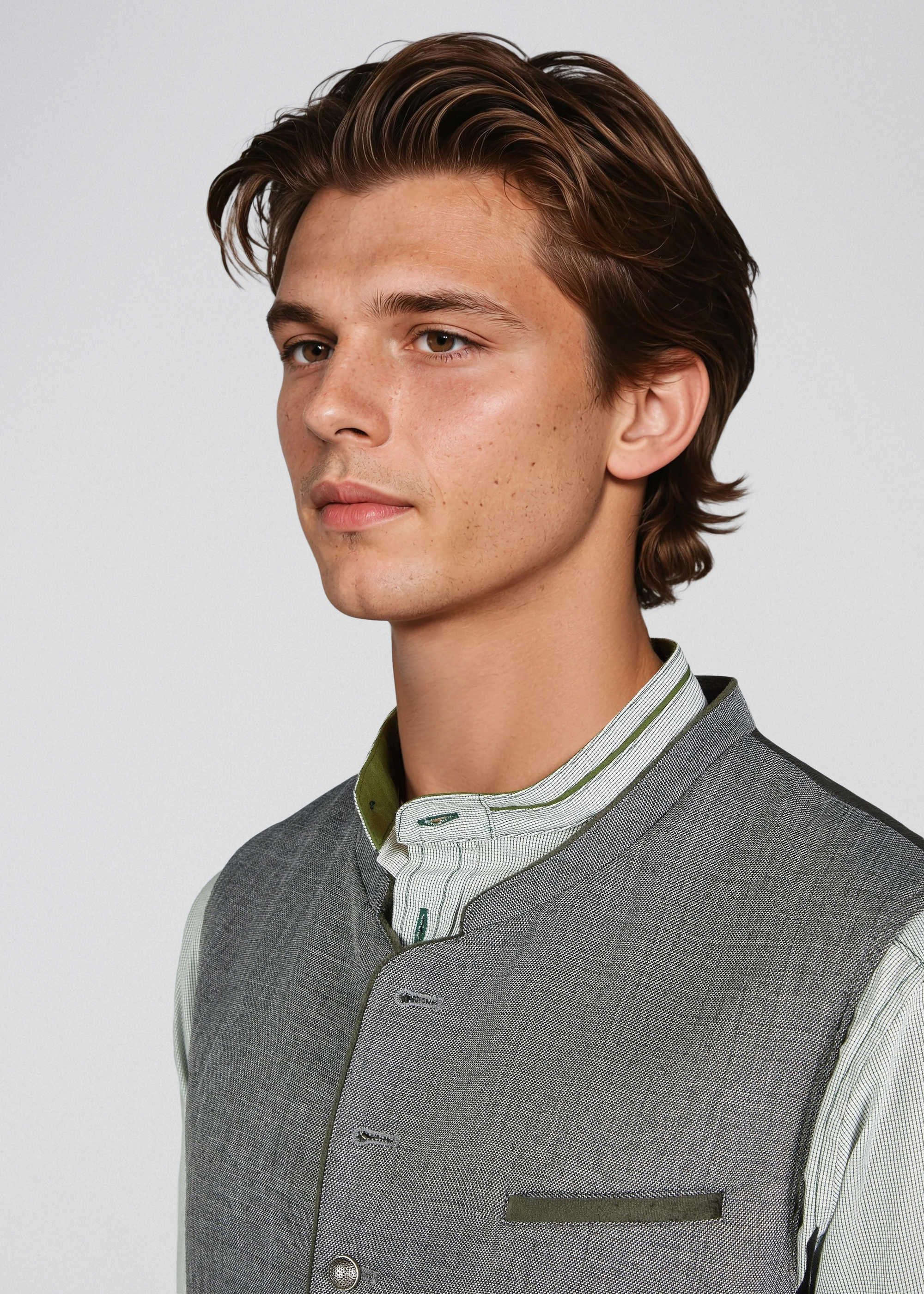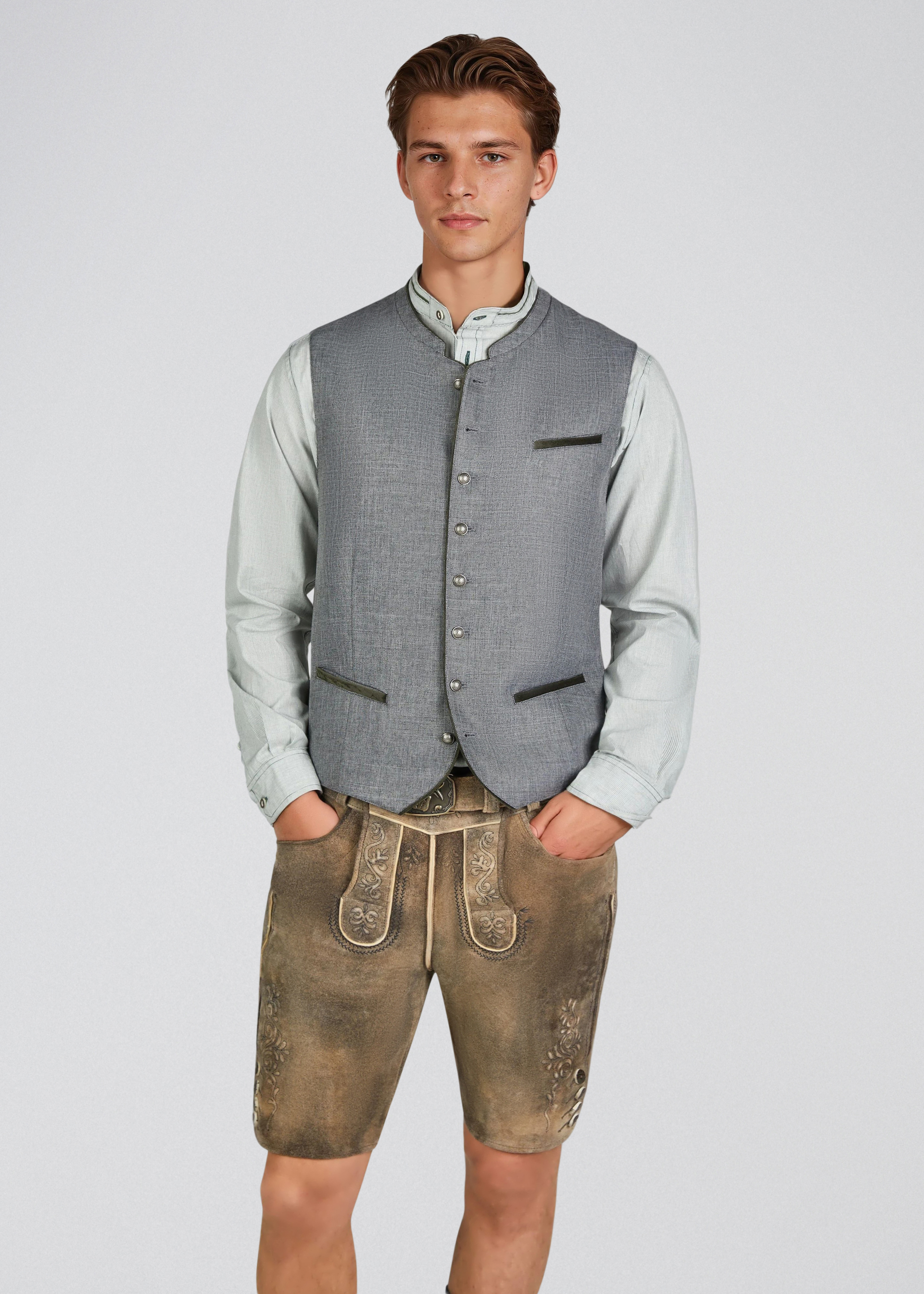 Hakim-Trachtenweste – rustikal in Grün Die Hakim-Trachtenweste für Herren besticht durch eine natürliche Leinenoptik und verleiht jedem Outfit einen rustikalen, traditionellen Charme. Silberne Knöpfe und ein Stehkragen setzen stilvolle Akzente und sorgen für ein klassisches Trachten-Design. Die Weste bietet eine bequeme Passform und lässt sich vielseitig zu Trachtenhemden, Lederhosen oder legeren Outfits kombinieren – ideal für Feste, Feiern oder traditionelle Anlässe.