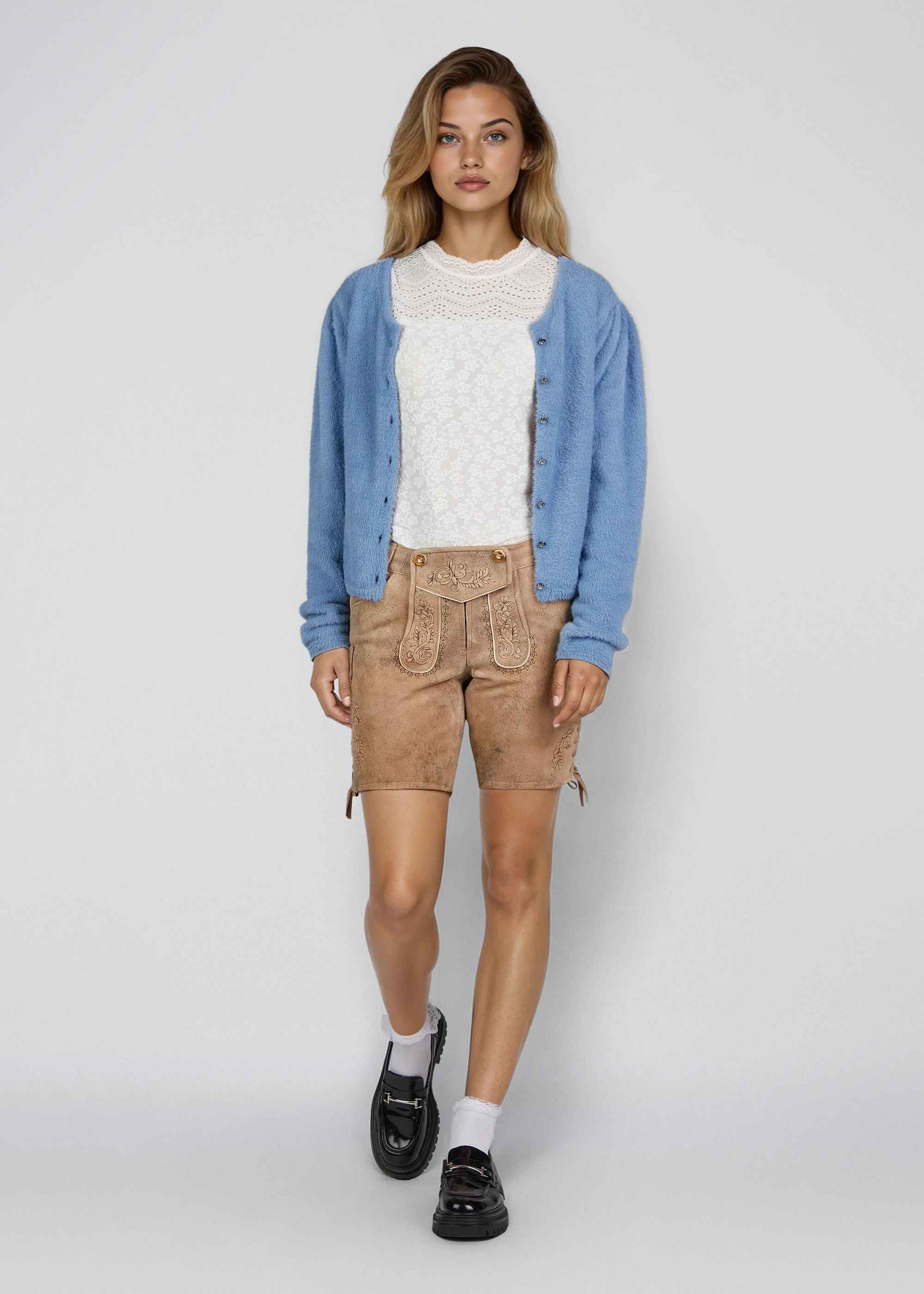 Die Strickjacke „Hulla“ überzeugt mit weichem Tragekomfort und einer angenehmen Passform. Auffällige Glitzerknöpfe setzen charmante Akzente, während der klassische Rundhalsausschnitt einen harmonischen Look schafft. Ein farbenfrohes Must-have, das sich ideal über Dirndl oder Trachten-Outfits kombinieren lässt.