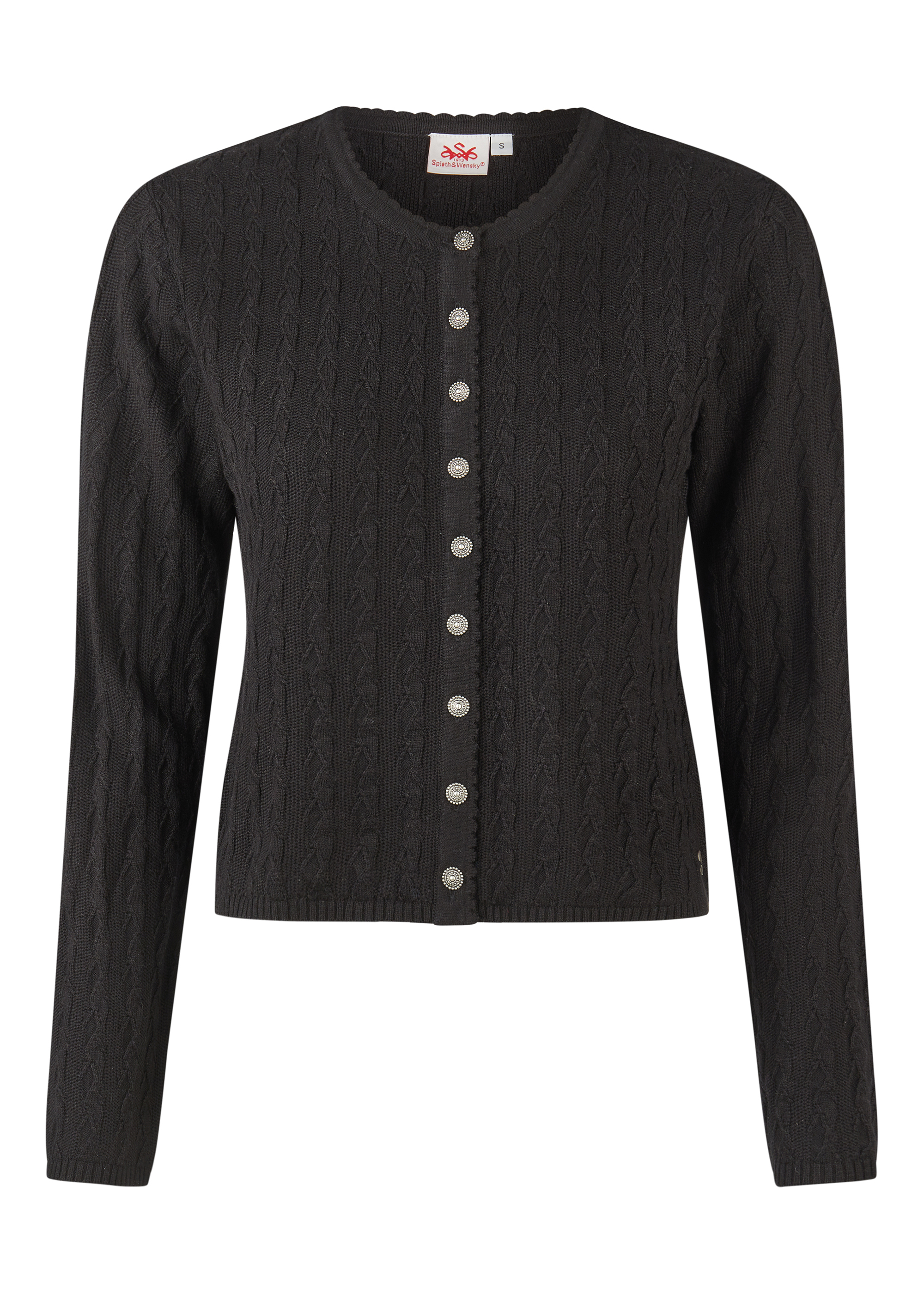 Die Strickjacke „Hummeltal“ überzeugt mit klassischem Zopfmuster und femininen Details. Der sanft geschwungene Wellensaum am Kragen verleiht dem Modell eine weiche, traditionelle Anmutung, während der Rundhals-Ausschnitt vielseitige Kombinationsmöglichkeiten bietet – ideal über Dirndl, Blusen oder schlichte Shirts. Stilprägende Knöpfe setzen dezente Akzente und unterstreichen den trachtigen Charakter. Der Materialmix sorgt für ein angenehm leichtes Tragegefühl und macht die Jacke formstabil und pflegeleicht.