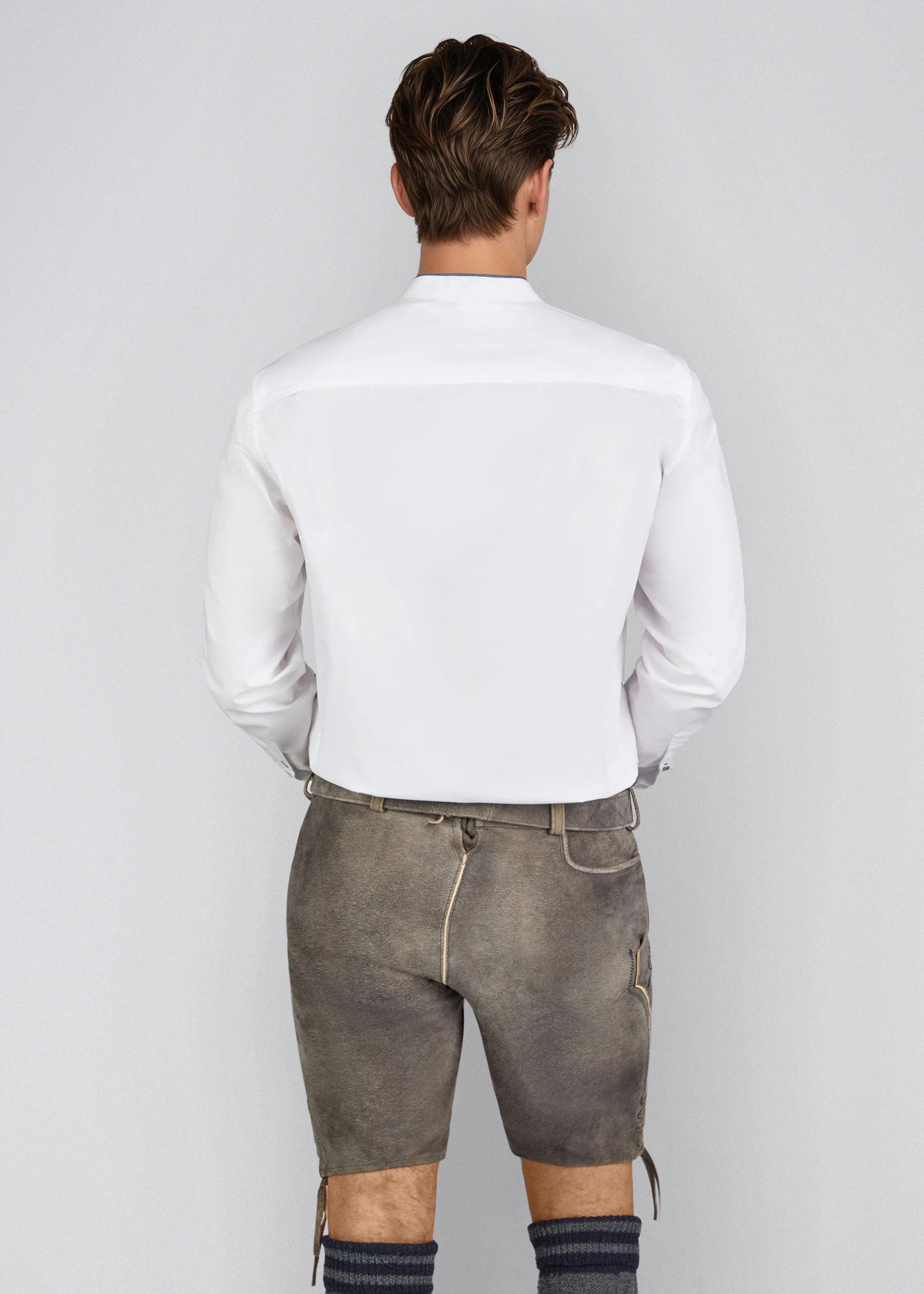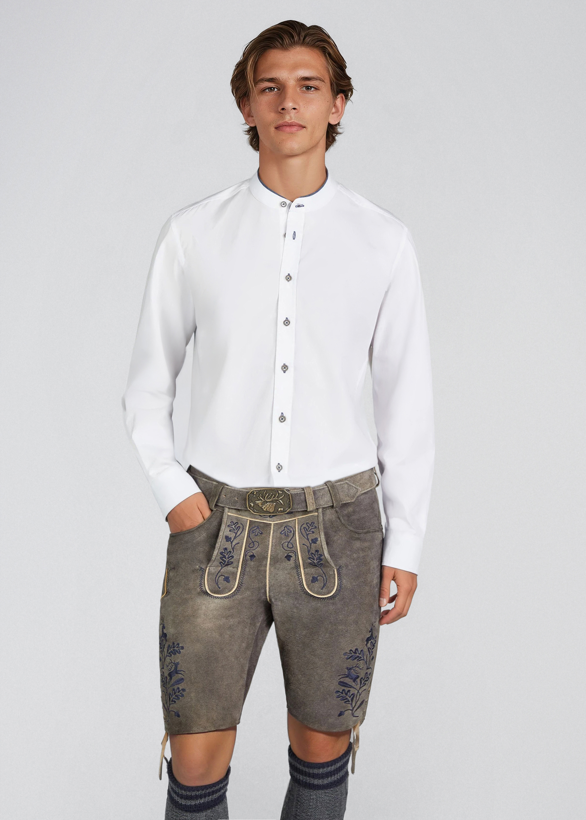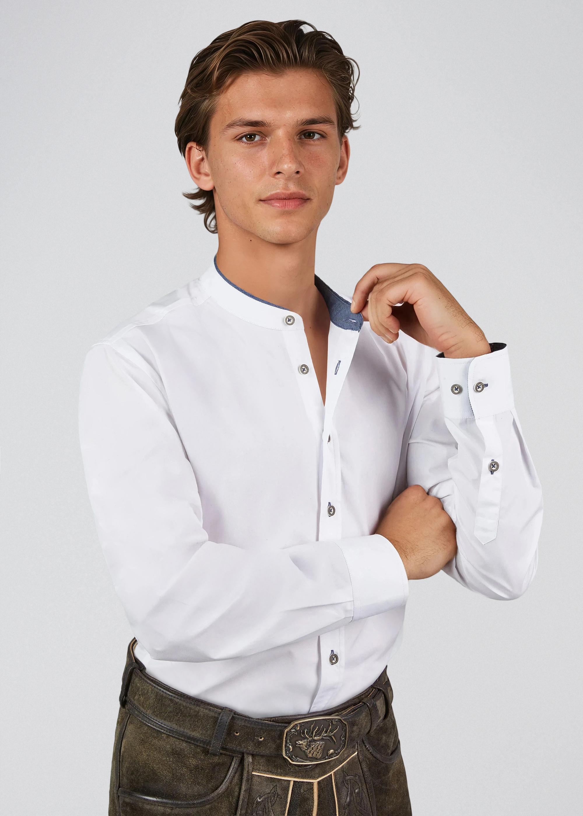 Das Trachtenhemd „TG-Falkland“ überzeugt durch seine klare, zurückhaltende Optik und feine Verarbeitung. Der Stehkragen und die kleinen Knöpfen in Hirschhornoptik unterstreichen den klassischen Trachtenstil, während der graue Kontrastbesatz im Innenkragen und an den Manschetten dem Hemd eine moderne Nuance verleiht. Die Passform ist im Slim-Fit-Schnitt gearbeitet und lässt sich hervorragend mit Lederhose oder Weste kombinieren. Der Materialmix sorgt für ein angenehmes Tragegefühl und eine dauerhaft schöne Passform.