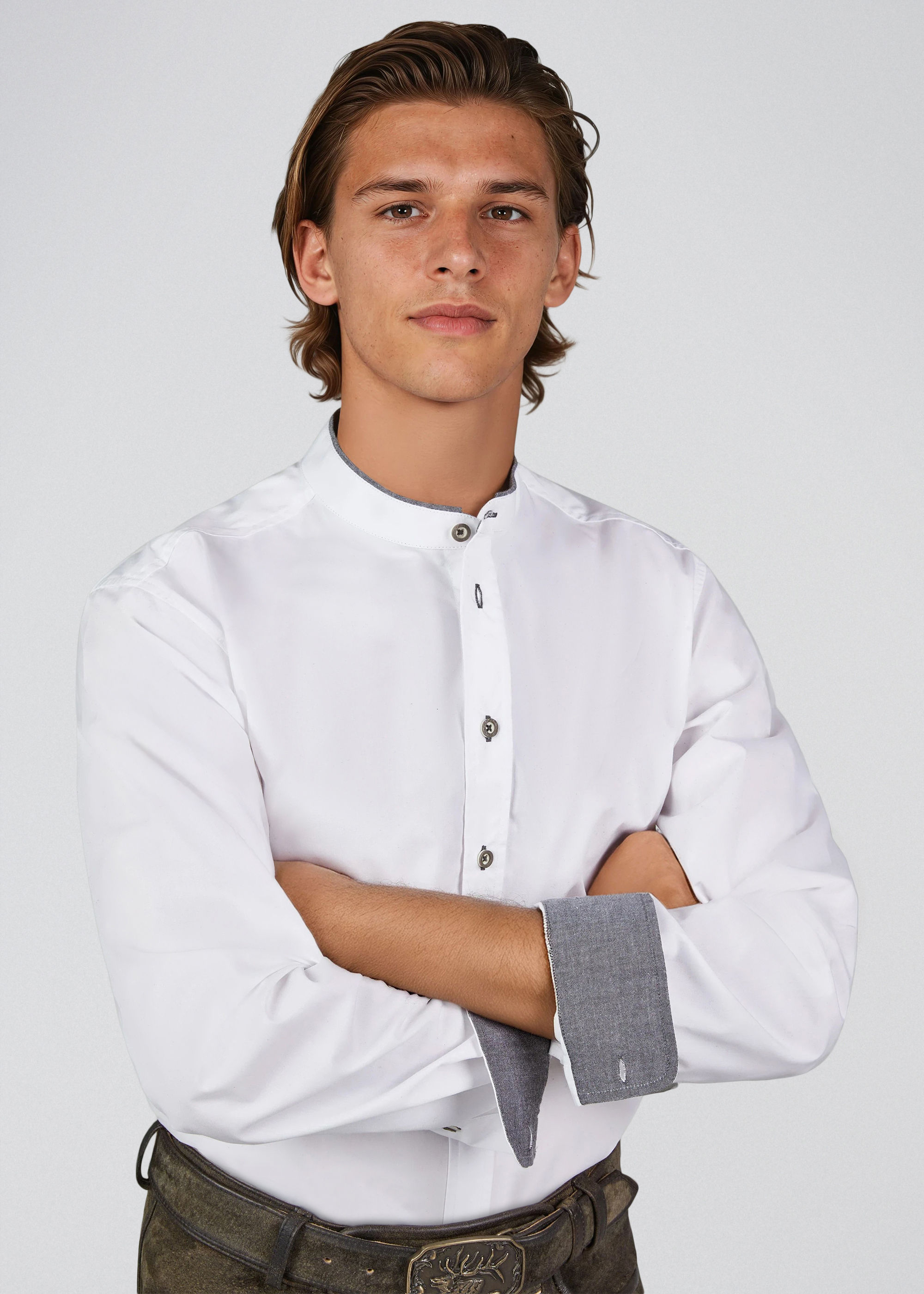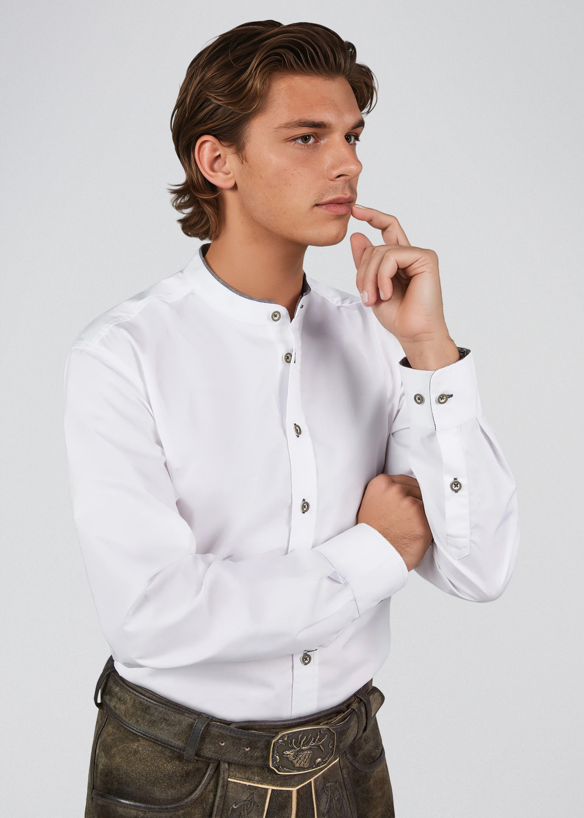 Das Trachtenhemd „TG-Falkland“ überzeugt durch seine klare, zurückhaltende Optik und feine Verarbeitung. Der Stehkragen und die kleinen Knöpfen in Hirschhornoptik unterstreichen den klassischen Trachtenstil, während der graue Kontrastbesatz im Innenkragen und an den Manschetten dem Hemd eine moderne Nuance verleiht. Die Passform ist im Slim-Fit-Schnitt gearbeitet und lässt sich hervorragend mit Lederhose oder Weste kombinieren. Der Materialmix sorgt für ein angenehmes Tragegefühl und eine dauerhaft schöne Passform.